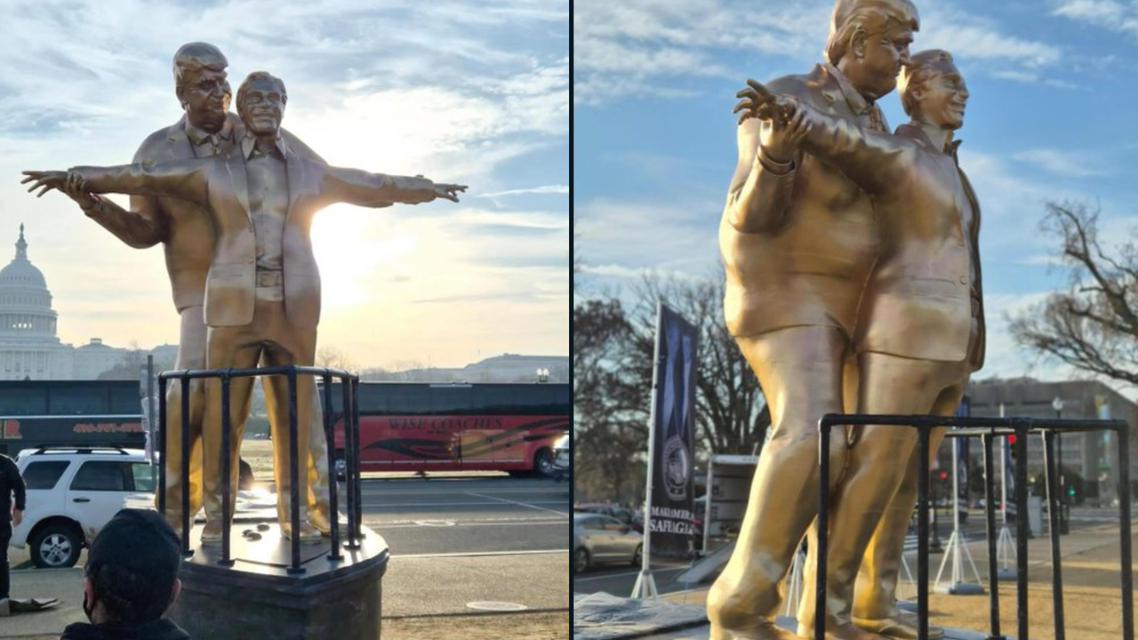 Donald Trump ile Jeffrey Epstein'ı temsil eden iki heykel Titanik filminin ünlü sahnesini canlandırıyor.